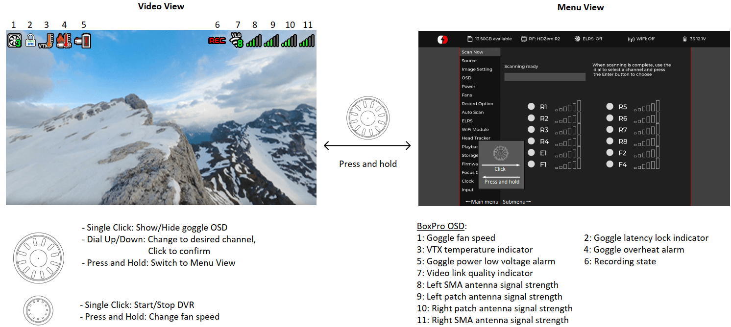 By Dialing up/down, video channel number can be tuned on video mode for HDZero receiver input. However, this can be disabled by putting a file named as “no_dial.txt” on SD card root directory when booting up.