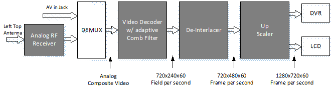 It uses a video decoder with an adaptive comb filter to separate Y/C from the composite video;