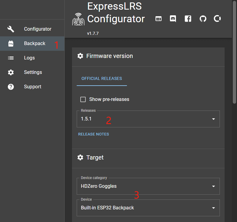 3. Select target HDZero Goggles -> Built-in ESP32 Backpack