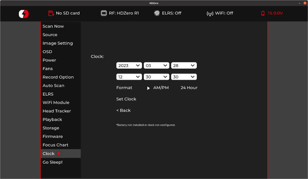 The HDZero BoxPro is equipped with a Real Time Clock. For initial setup, the RTC can be configured through the Clock Page, which will set both the system clock and hardware clock when you use the "Set Clock" function. Otherwise, when the goggles boot up, they will default to the last date and time set by the user since the "Set Clock" command was last applied.