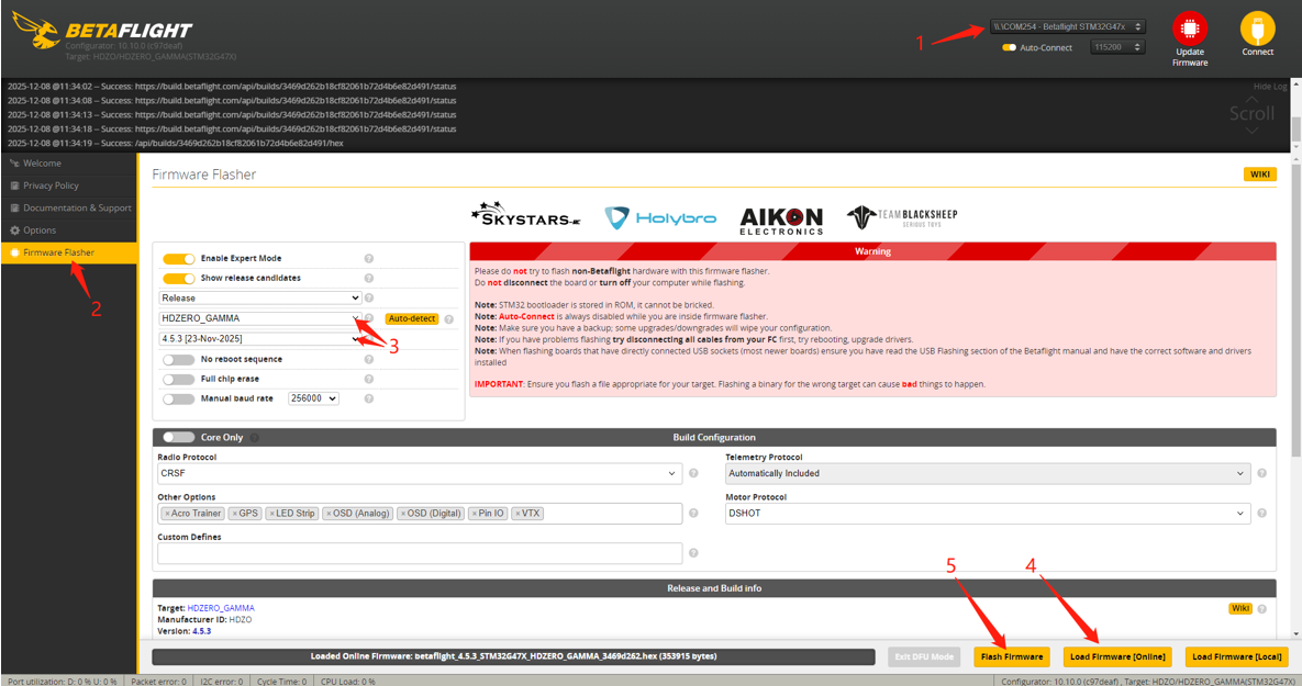 7. Select target "HDZERO_GAMMA" and version, The factory version is 4.5.3[23-Nov-2025]