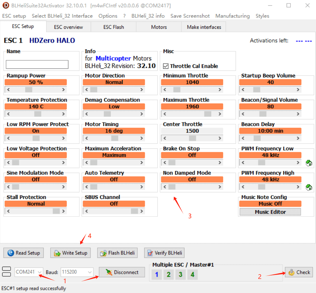 • Adjust parameters as needed, Write Setup to save the setting to ESCs