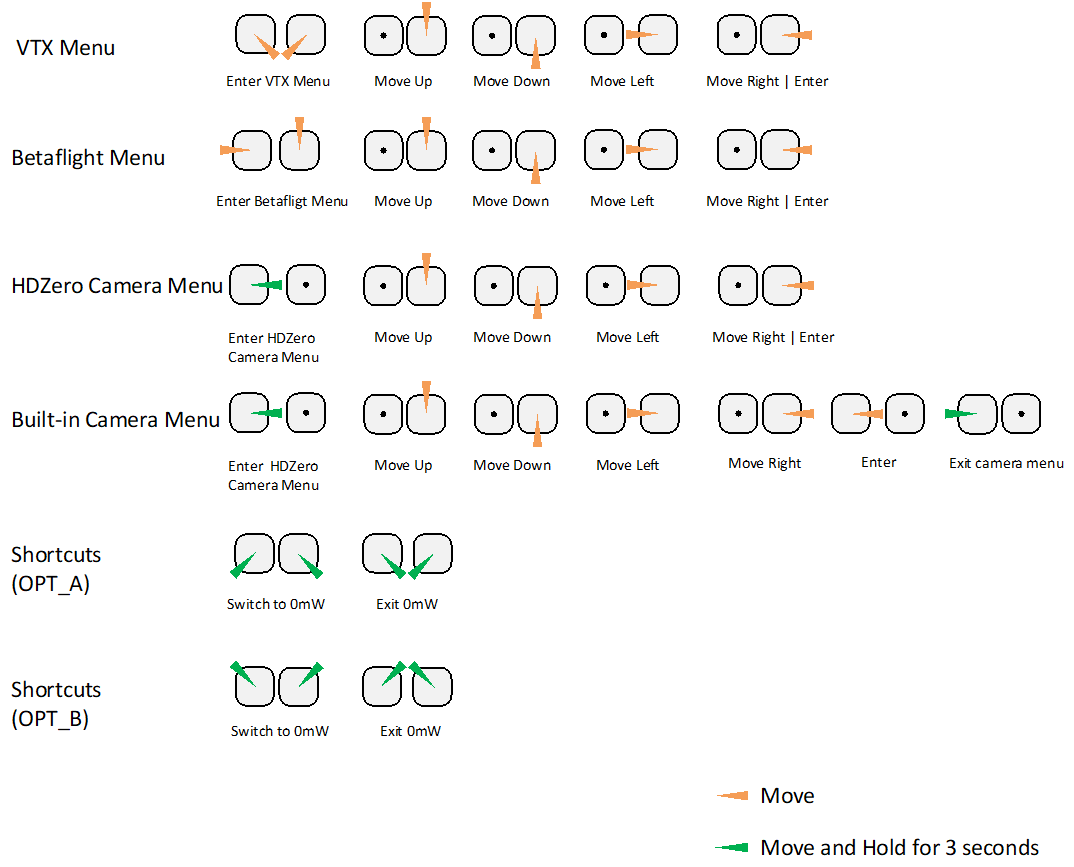 - When you are waiting for ARM command from race director, Use Stick Command (OPT-A / ) to enter into 0mW to avoid VTX overheats, no video in goggle
